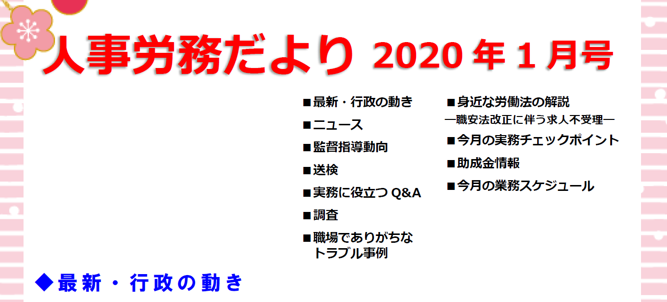 人事労務だより2020年1月号 2019年12月28日 Tweet Pocket バージョン ダウンロード 7 ファイルサイズ 1.70 MB ファイル数 1 投稿日 2019年12月28日 最終更新日時 2020年1月30日 ダウンロード or download free [free_download_btn] 説明 上記のボタンよりダウンロードできます。 今後も、様々な問題を取り上げてまいります。 取り上げております内容等についてご質問・ご相談ございましたら、当ホームページの問い合わせフォームよりお気軽にご連絡ください。 弊社では、現在、無料相談を実施しております。 [changelog] カテゴリー & タグ Similar Downloads 関連ダウンロードが見つかりません ! 瀧㟢 康太 Updated 2020年1月30日 FacebookXBlueskyHatenaCopy