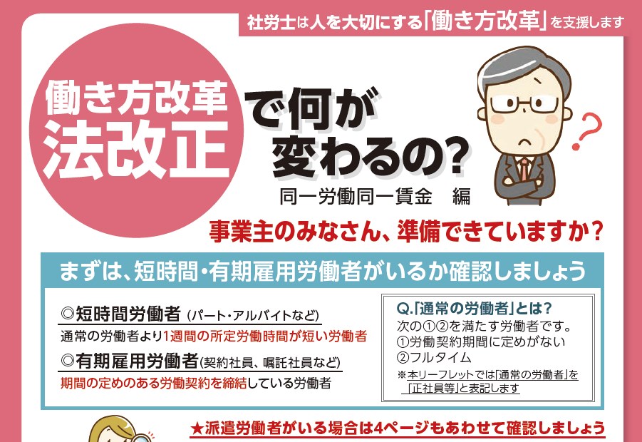 働き方改革で何が変わるの?(同一労働同一賃金編) 2020年1月30日 瀧㟢 康太 Tweet Pocket バージョン ダウンロード 6 ファイルサイズ 2.16 MB ファイル数 1 投稿日 2020年1月30日 最終更新日時 2020年1月30日 ダウンロード 説明 ダウンロードのボタンからダウンロードしてください。 全国社会保険連合会が作成した働き方改革の同一労働同一賃金に関するリーフレットです。 チェックリストで分かりやすくまとまっています。