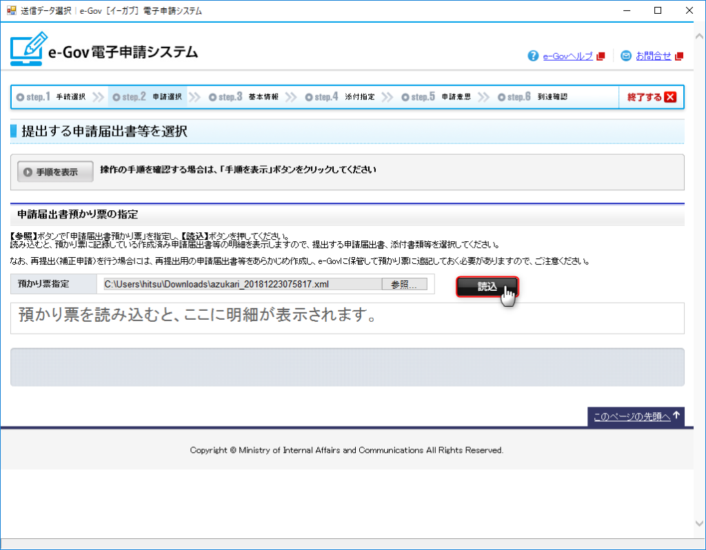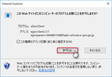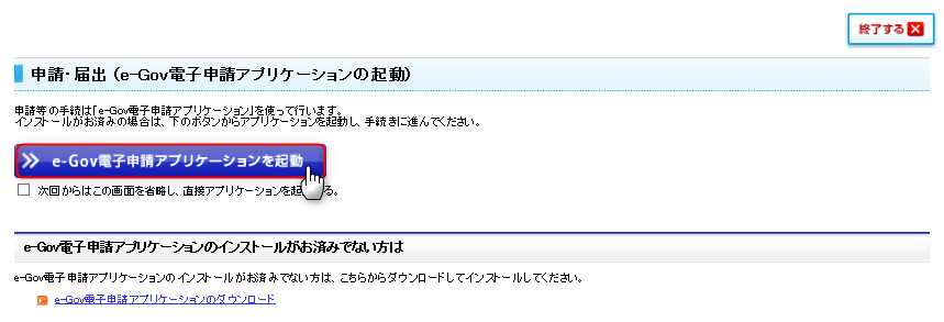 このように表示されたら、e-Gov電子申請アプリケーションを起動させます。