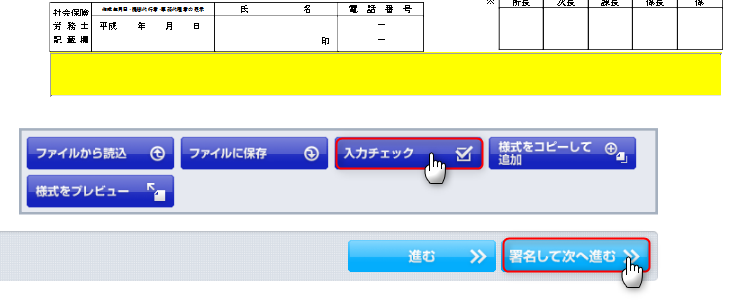 【入力チェック】を行い、エラーがなくなれば、【署名して次へ進む】