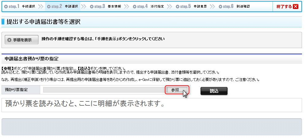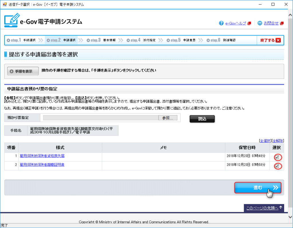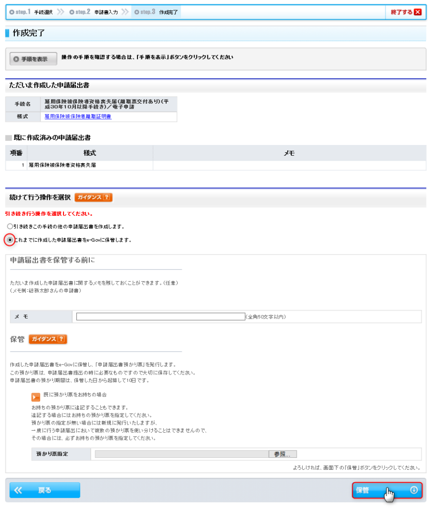 ここでは、【これまでに作成した申請届出書をe-Govに保管します。】を選びます。