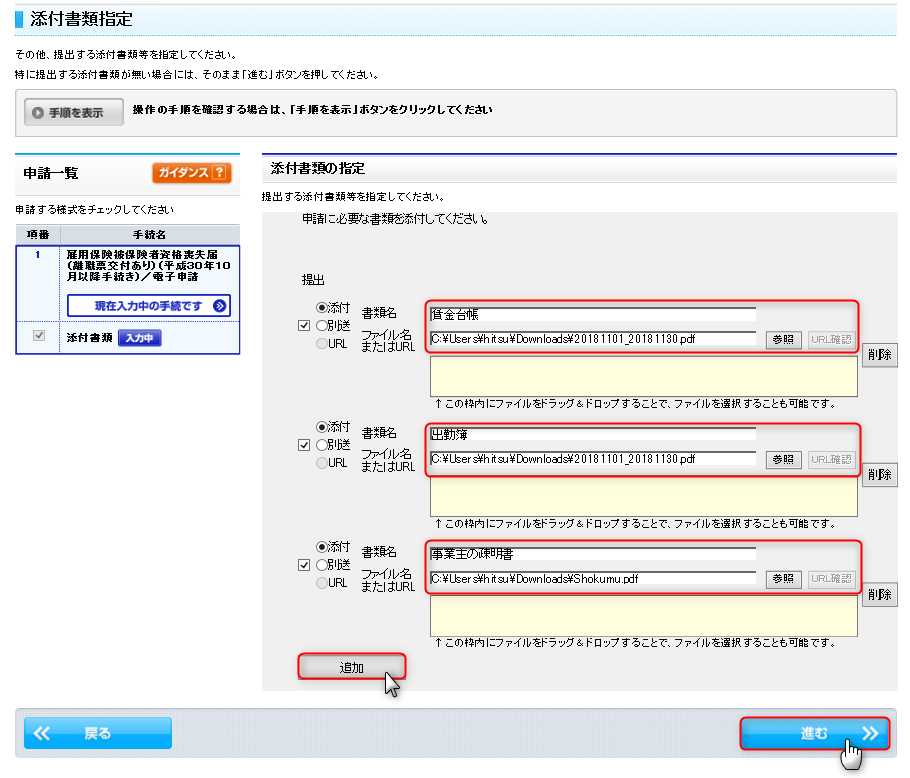 【追加】ボタンを押すと2つ、3つと書類を付けることができます。