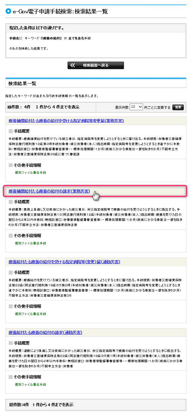 このように検索結果には、療養補償給付たる療養の給付の請求(業務災害)が表示されています。