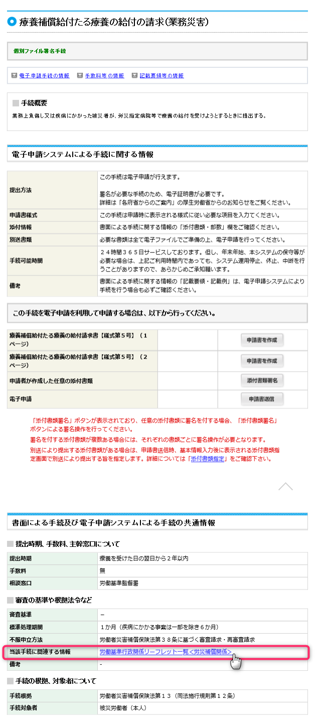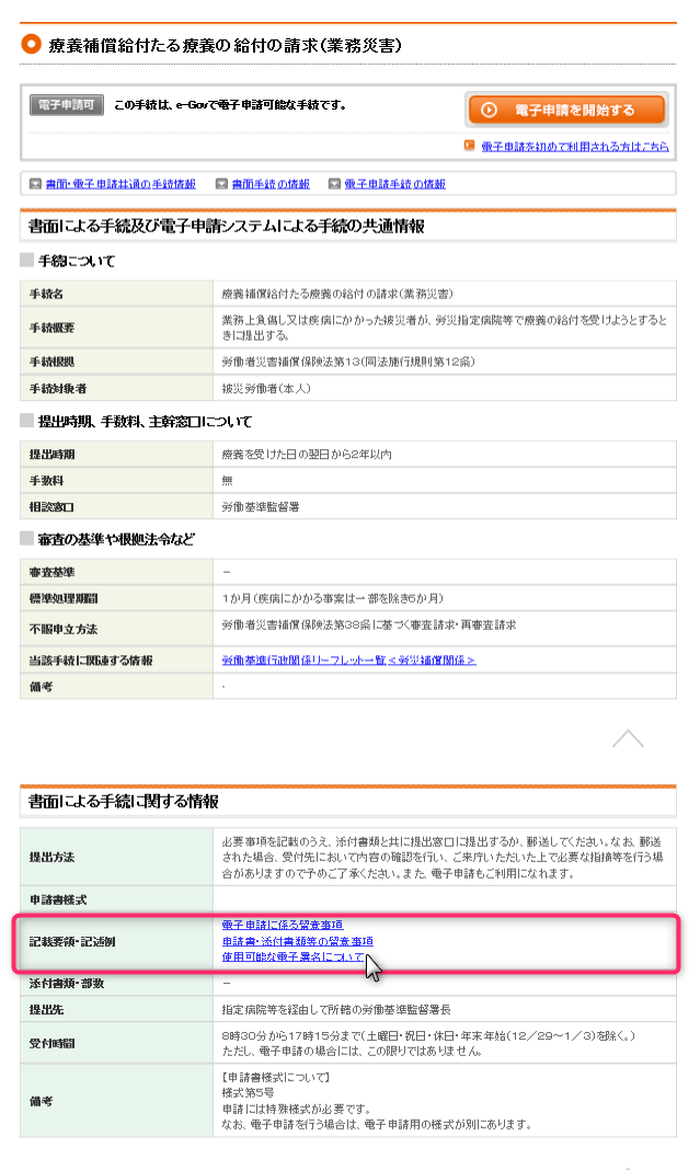 よくある手続きの一つである療養補償給付(業務災害)を検索してみます。
