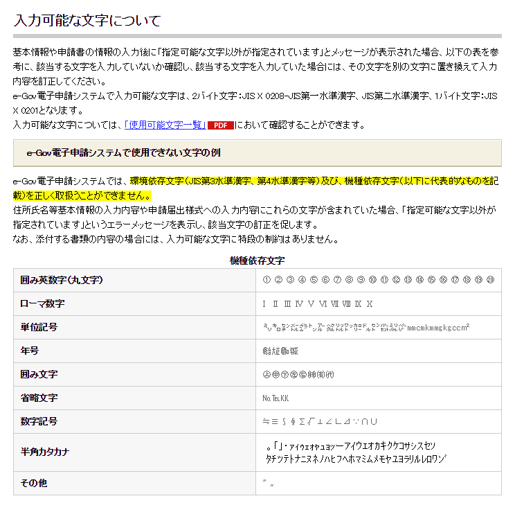 使用できる文字については、e-Govの以下のサイトに一覧がダウンロードできます。