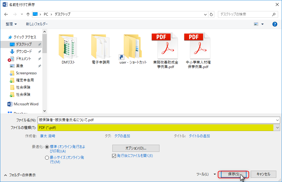 そのまま保存するとワード文書になってしまいますので、PDFファイルであることを確認してください。