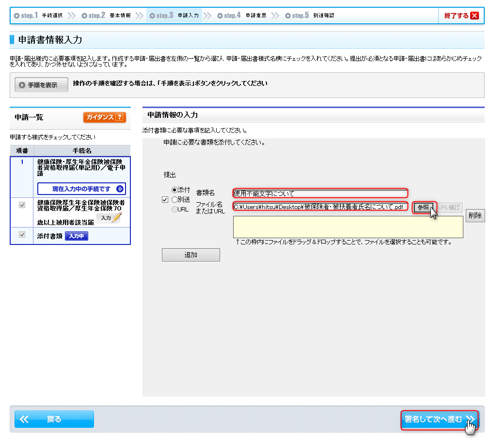 CSVファイル添付方式で行っている方につきましても、指定文字以外は使用できませんので、添付書類を付けて提出してください。
