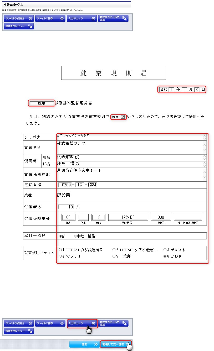 入力が済んだら【入力チェック】を行い【署名して次へ進む】