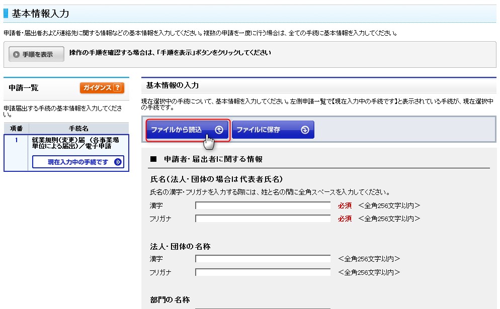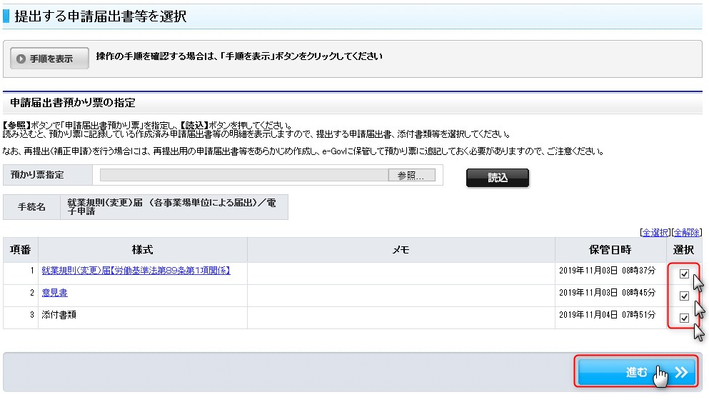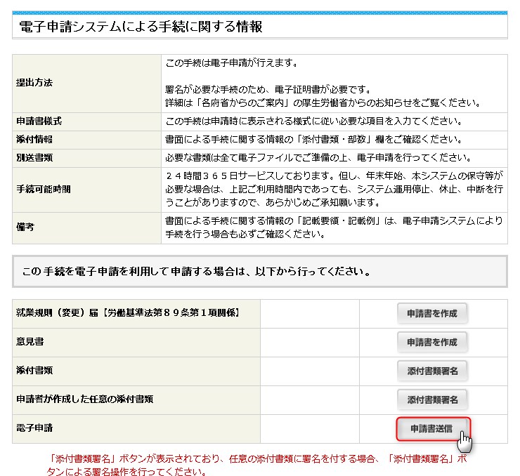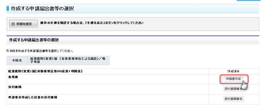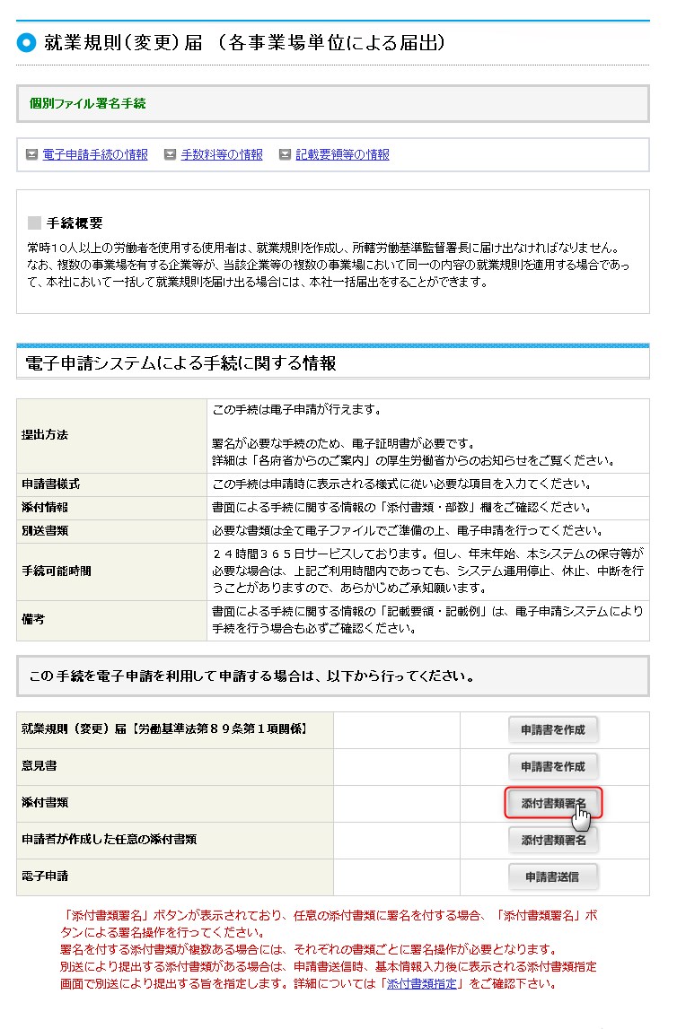 ここから、電子申請の本則や賃金規定、育児介護休業規定などを添付して最終的に電子申請を行います。