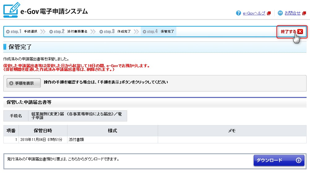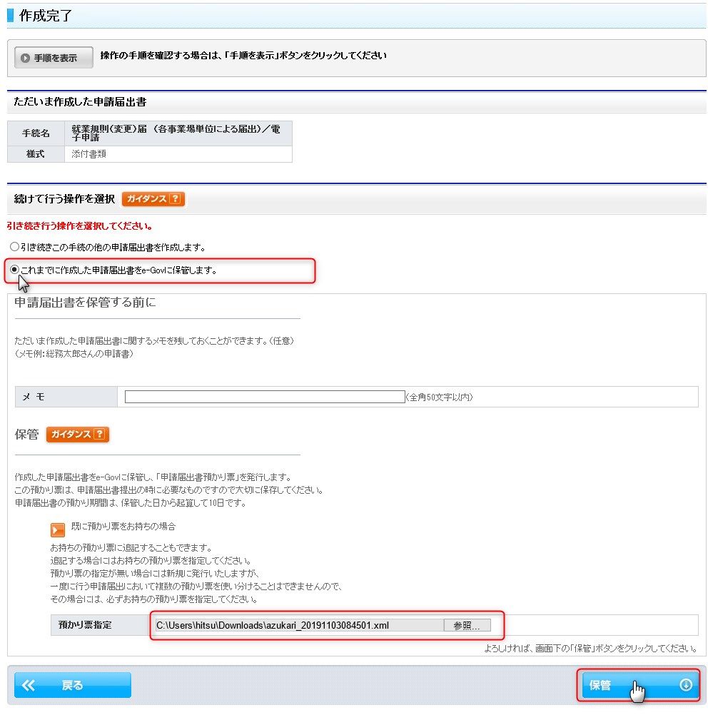 ここでは、【これまでに作成した申請届出書をe-Govに保管します。】を選択
