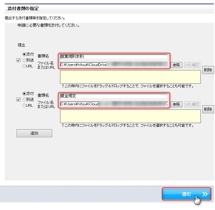 規定がわかれている場合は、【追加】ボタンから複数ファイルを添付することができます。