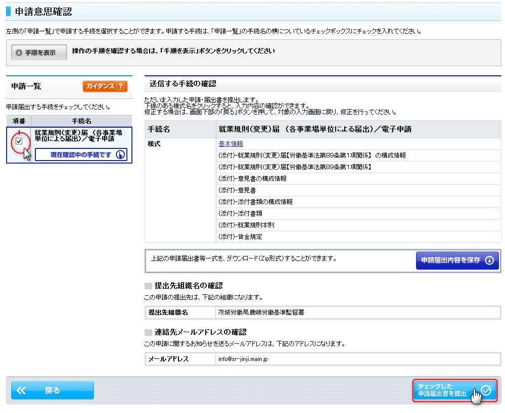 内容を確認して、チェックをつけて【チェックした申請届出書を提出】
