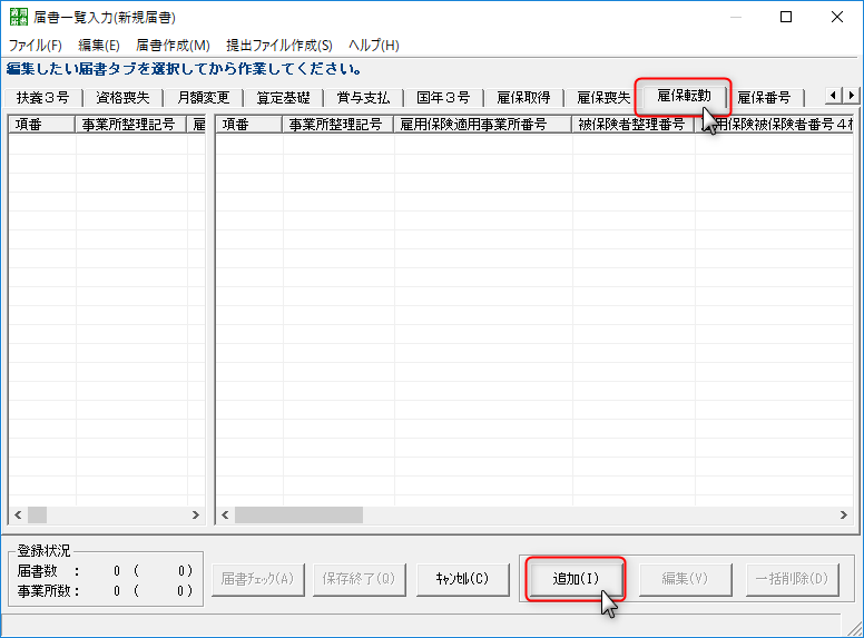 日本年金機構の届書作成プログラムを使う場合は、アプリを開き【届出書を作成】をクリックし、【雇保転勤】のタブを選択します。