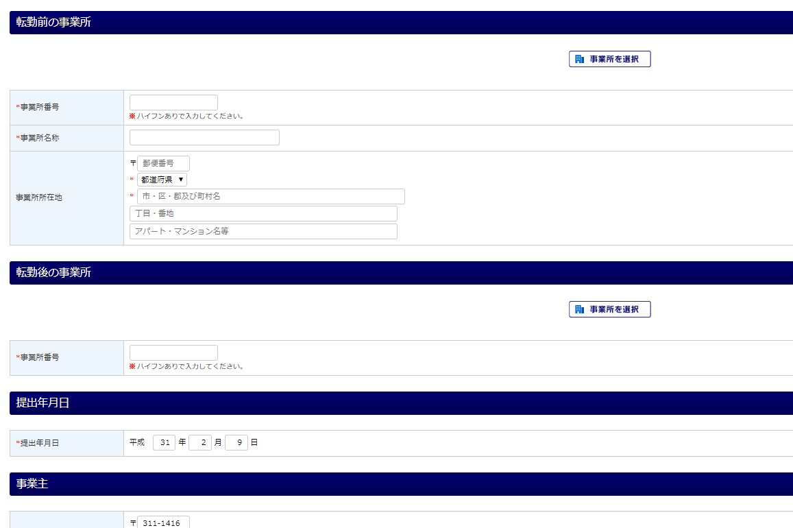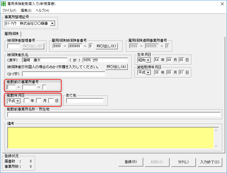 転勤前の事業所番号と転勤年月日を入力