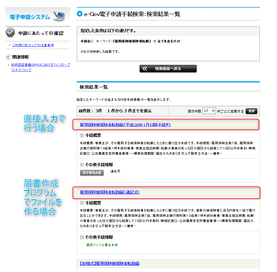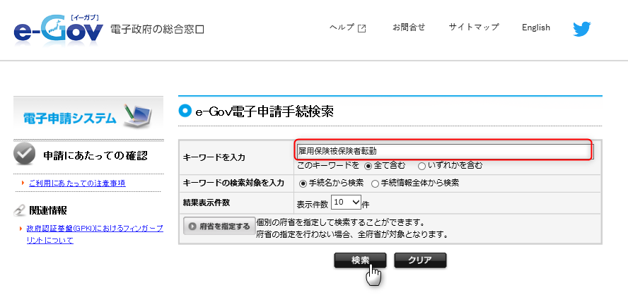 まずは、e-Govのサイトから手続き検索を行います。